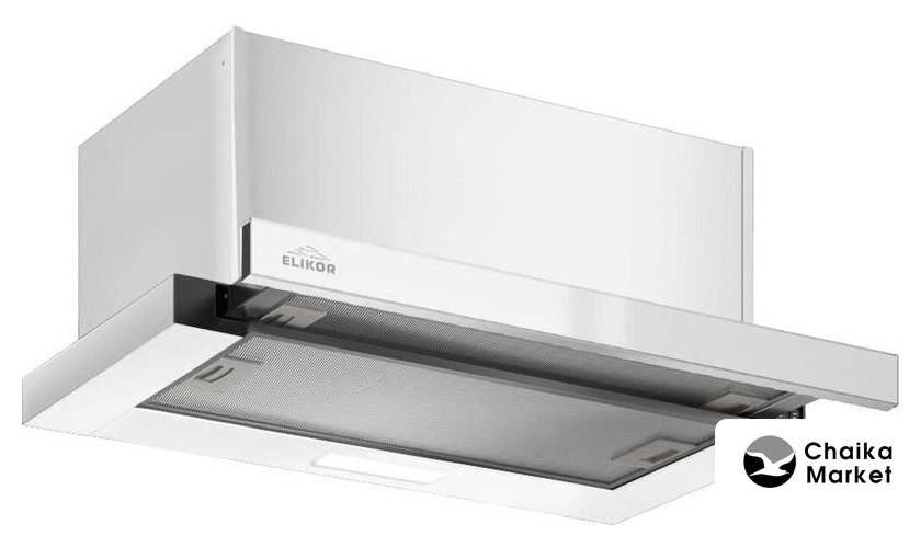 конструкция телескопическая, монтаж для встраивания, ширина 60 см, управление механическое/кнопочное, производительность мотора 1000 м³/ч, цвет белый