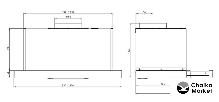 конструкция купольная, монтаж настенный, управление механическое/кнопочное, производительность мотора 500 м³/ч, ширина 50 см