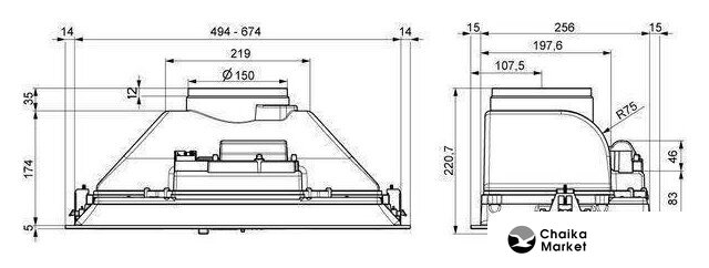 конструкция скрытая, монтаж для встраивания, ширина 42 см, управление механическое/кнопочное, производительность мотора 430 м³/ч, цвет серый/хром