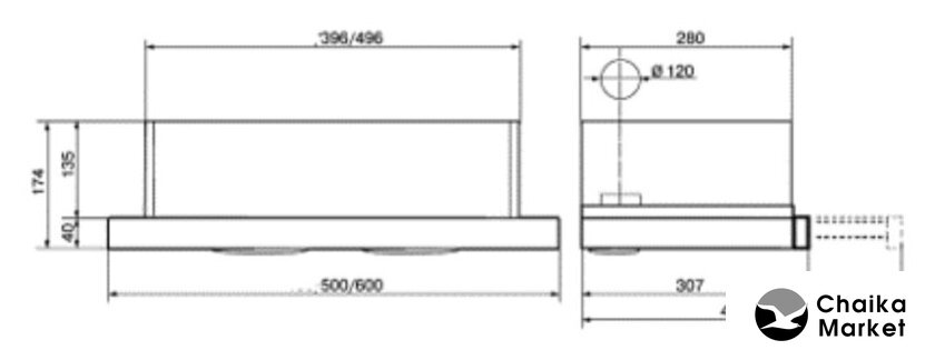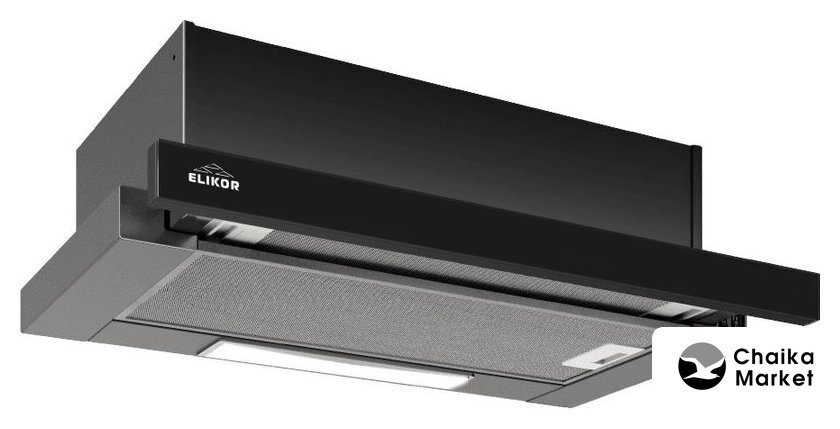 конструкция телескопическая, монтаж для встраивания, управление механическое/кнопочное, производительность мотора 400 м³/ч, ширина 60 см