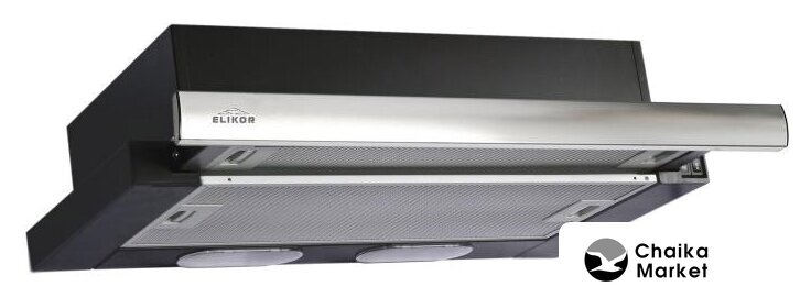 конструкция плоская, монтаж настенный, ширина 60 см, управление механическое/кнопочное, производительность вытяжки 300 м³/ч, цвет черный