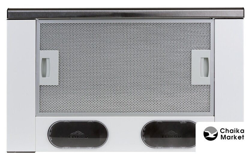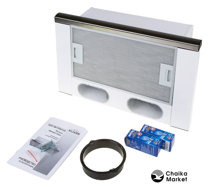 конструкция скрытая, монтаж для встраивания, ширина 59.8 см, управление механическое/кнопочное, производительность мотора 500 м³/ч, цвет хром