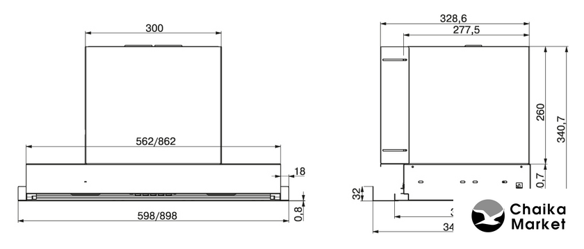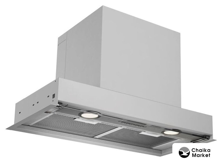 конструкция наклонная, монтаж настенный, ширина 59.6 см, управление механическое/кнопочное, производительность мотора 750 м³/ч, цвет нержавеющая сталь/черный