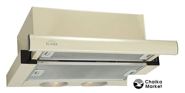конструкция телескопическая, монтаж для встраивания, ширина 60 см, управление механическое/кнопочное, производительность мотора 400 м³/ч, цвет бежевый