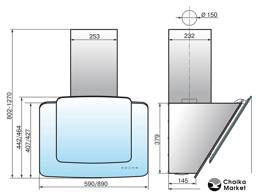 конструкция наклонная, монтаж настенный, ширина 90 см, управление сенсорное, производительность мотора 1000 м³/ч, цвет черный