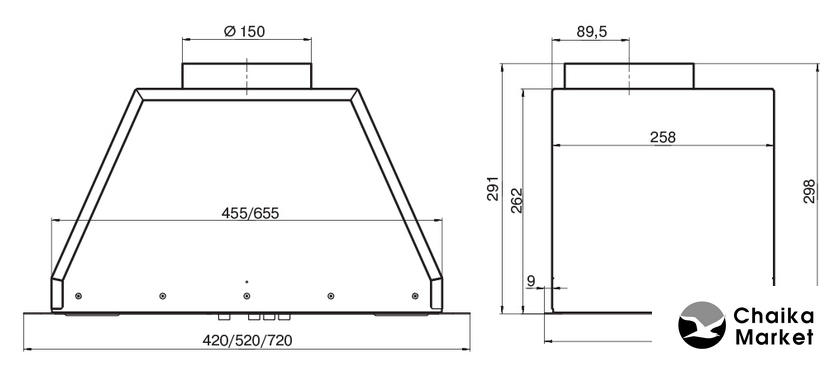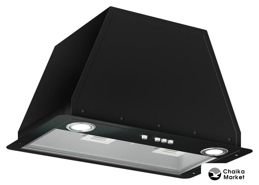 конструкция скрытая, монтаж для встраивания, ширина 59.8 см, управление механическое/кнопочное, производительность мотора 1050 м³/ч, цвет черный