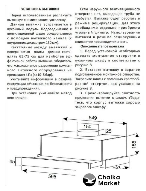 конструкция скрытая, монтаж для встраивания, ширина 49.8 см, управление механическое/слайдерное, производительность мотора 850 м³/ч, цвет белый