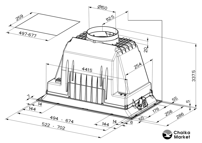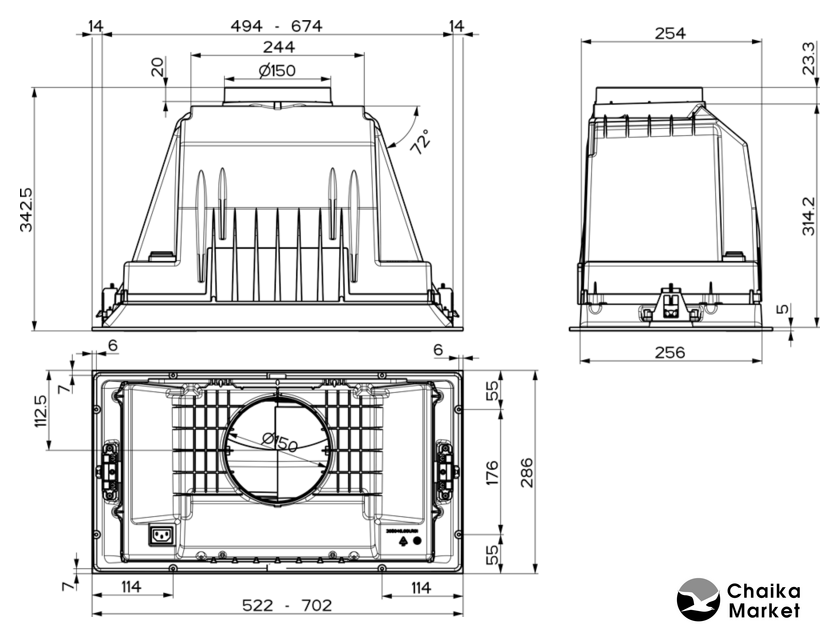 конструкция скрытая, монтаж для встраивания, ширина 71.4 см, управление электронное/кнопочное, производительность вытяжки 550 м³/ч, производительность мотора 1050 м³/ч, цвет серебристый/серый