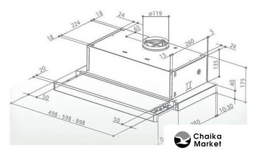 конструкция телескопическая, монтаж для встраивания, управление механическое/кнопочное, производительность мотора 400 м³/ч, ширина 60 см