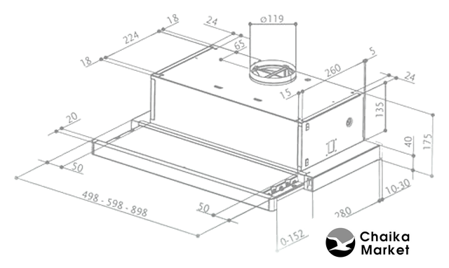 конструкция телескопическая, монтаж для встраивания, управление механическое/кнопочное, производительность мотора 400 м³/ч, ширина 60 см