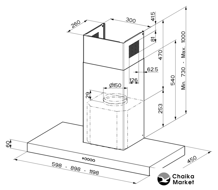 конструкция купольная, монтаж настенный, ширина 69.8 см, управление электронное, производительность вытяжки 600 м³/ч, цвет белый