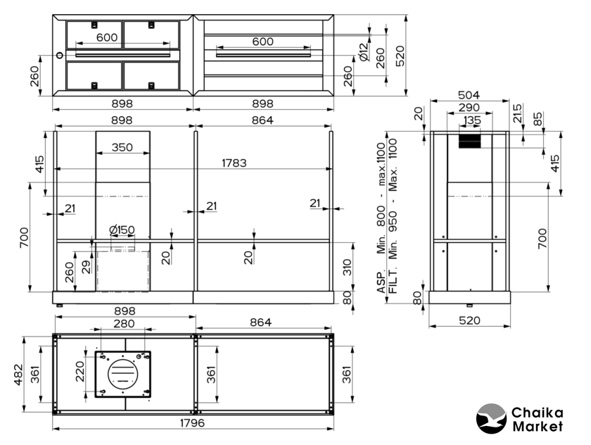| Минимальная производительность отвода | 300 куб. м/ч |
