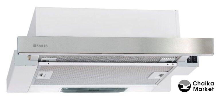 конструкция телескопическая, монтаж для встраивания, ширина 49.8 см, управление механическое/кнопочное, производительность мотора 400 м³/ч, цвет белый