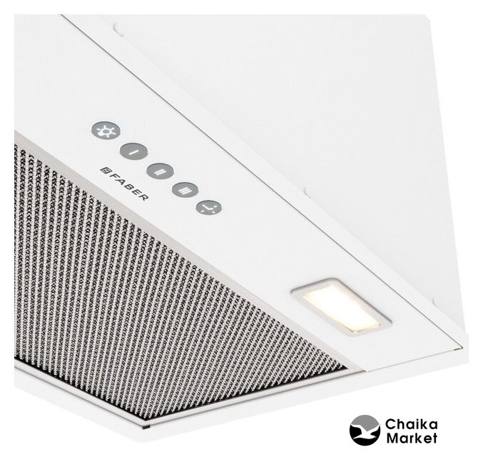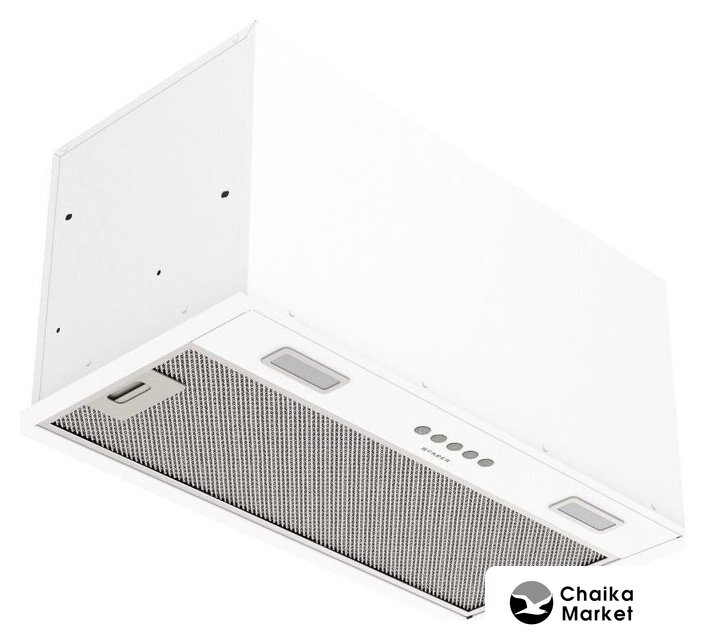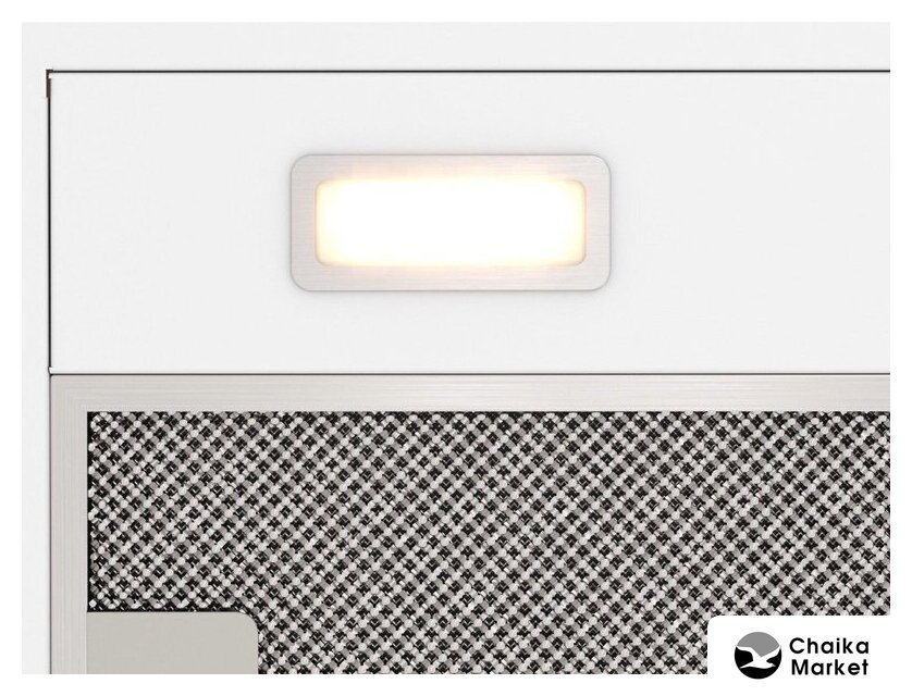 конструкция скрытая, монтаж для встраивания, ширина 59.8 см, управление механическое/кнопочное, производительность мотора 1150 м³/ч, цвет белый