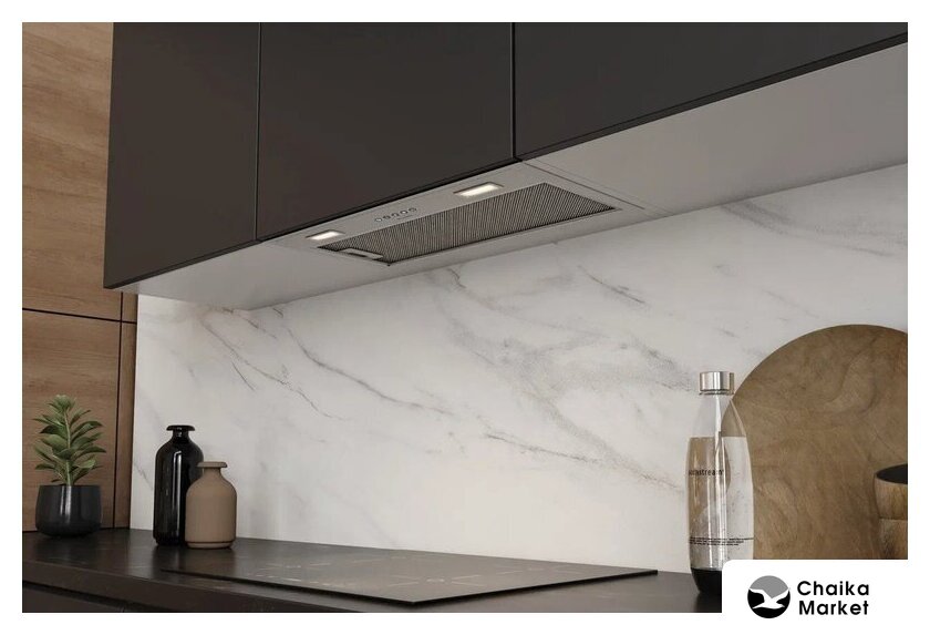 конструкция скрытая, монтаж для встраивания, ширина 55 см, управление механическое/кнопочное, производительность мотора 1000 м³/ч, цвет нержавеющая сталь