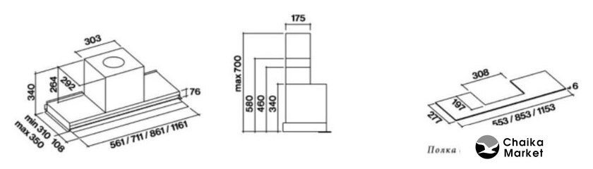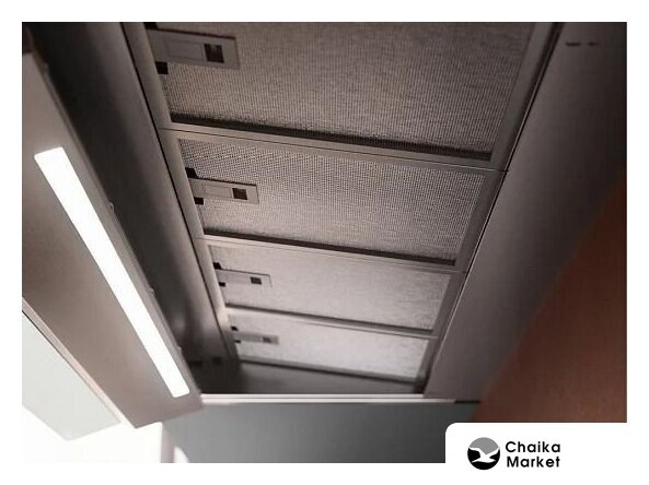 конструкция скрытая, монтаж для встраивания, ширина 56.3 см, управление электронное/кнопочное, производительность мотора 1040 м³/ч, цвет нержавеющая сталь