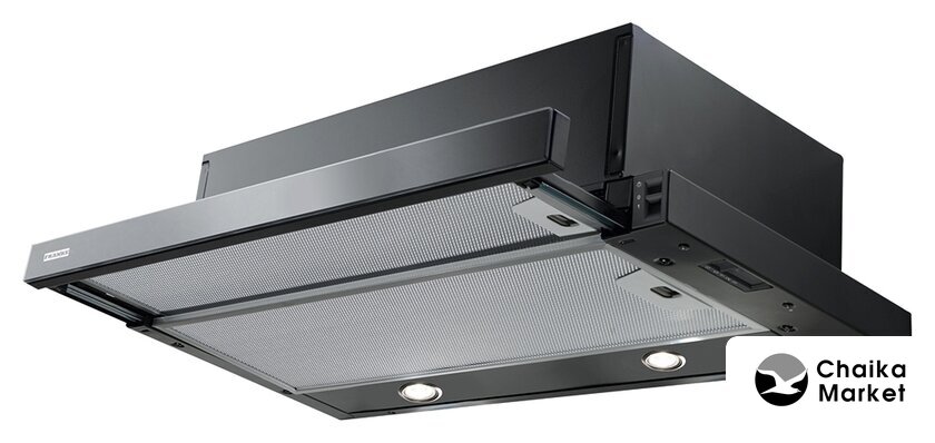 конструкция скрытая, монтаж для встраивания, ширина 54 см, управление электронное/кнопочное, производительность мотора 1000 м³/ч, цвет нержавеющая сталь