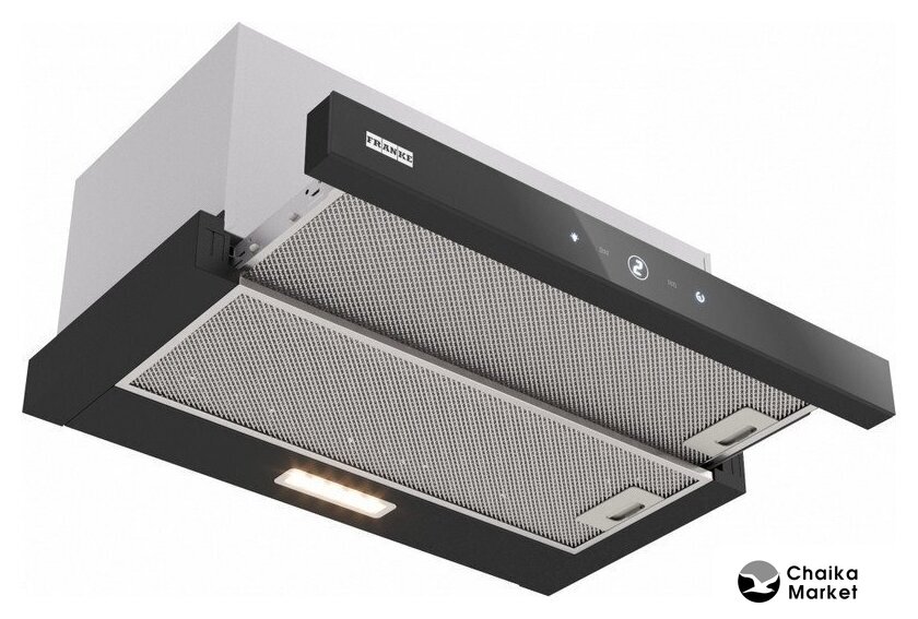 конструкция скрытая, монтаж для встраивания, ширина 60 см, управление механическое/кнопочное, производительность вытяжки 650 м³/ч, цвет черный