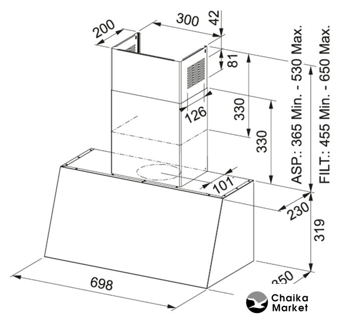 конструкция Т-образная, монтаж настенный, ширина 59.8 см, управление кнопочное, производительность вытяжки 610 м³/ч, цвет черный
