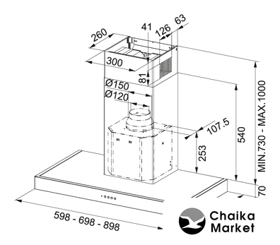 конструкция Т-образная, монтаж островной, ширина 89.7 см, управление электронное/кнопочное, производительность мотора 850 м³/ч, цвет нержавеющая сталь