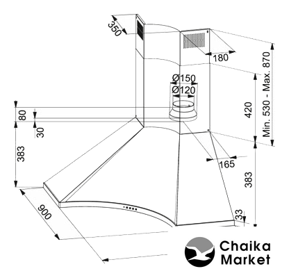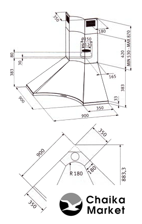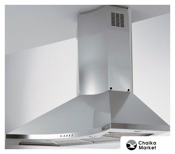 конструкция Т-образная, монтаж настенный, ширина 90 см, управление сенсорное, производительность вытяжки 453 м³/ч, цвет нержавеющая сталь/черный