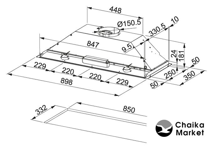 конструкция Т-образная, монтаж настенный, управление электронное/кнопочное, производительность мотора 720 м³/ч, ширина 59.8 см