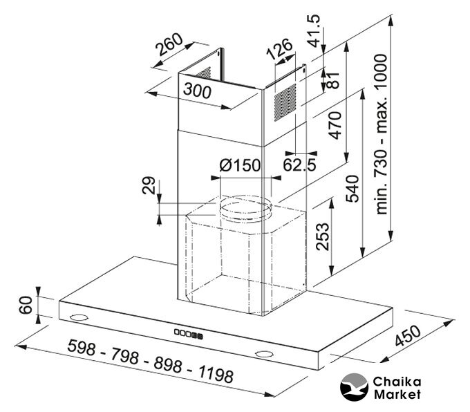 конструкция Т-образная, монтаж настенный, ширина 90 см, управление электронное/кнопочное, производительность вытяжки 480 м³/ч, цвет нержавеющая сталь