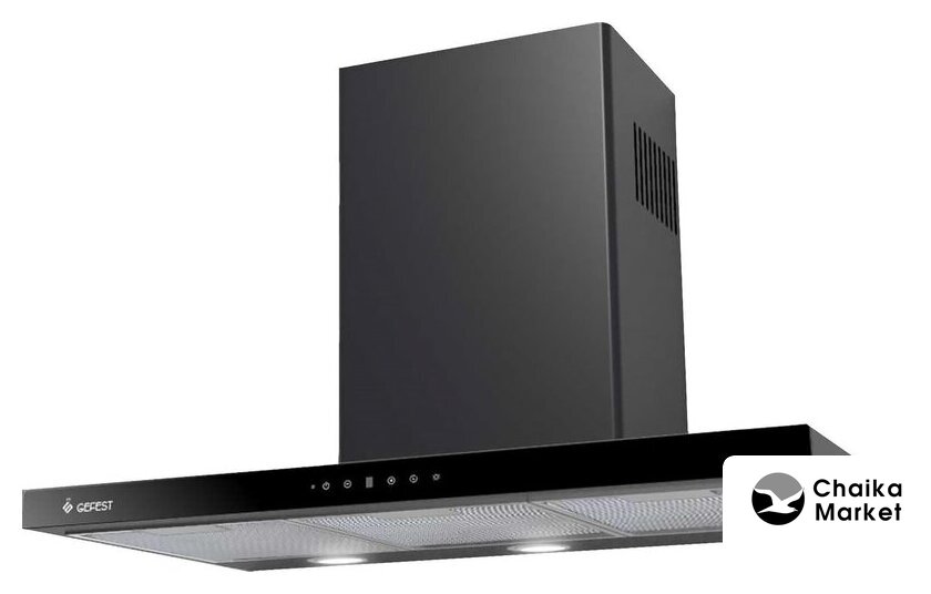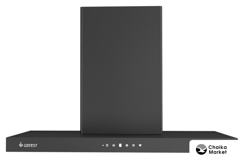 конструкция наклонная, монтаж настенный, ширина 90 см, управление сенсорное, производительность мотора 1000 м³/ч, цвет черный