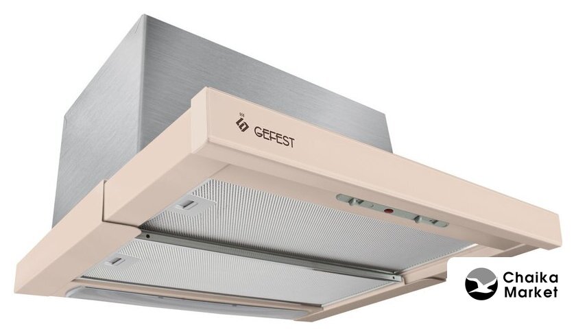 конструкция наклонная, монтаж настенный, ширина 50 см, управление механическое/кнопочное, производительность мотора 520 м³/ч, цвет бежевый