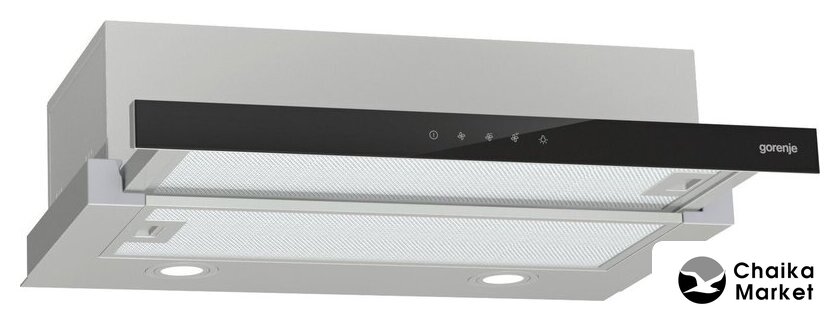 конструкция телескопическая, монтаж для встраивания, ширина 49.8 см, управление механическое/слайдерное, производительность вытяжки 310 м³/ч, цвет нержавеющая сталь