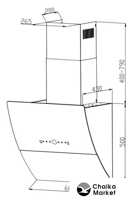 конструкция наклонная, монтаж настенный, ширина 60 см, управление механическое/кнопочное, производительность мотора 850 м³/ч, цвет нержавеющая сталь/черный