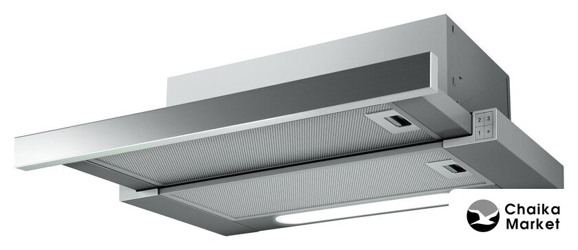 конструкция наклонная, монтаж настенный, ширина 60 см, управление механическое/кнопочное, производительность мотора 850 м³/ч, цвет нержавеющая сталь/черный