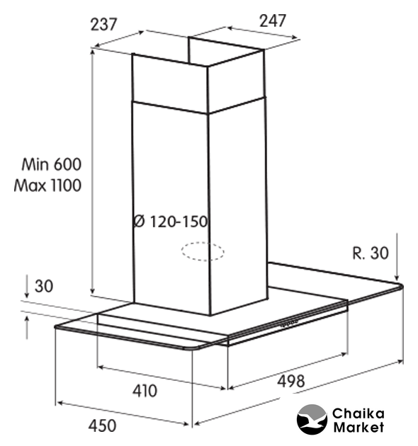 конструкция телескопическая, монтаж для встраивания, управление механическое/кнопочное, производительность мотора 900 м³/ч, ширина 59.8 см