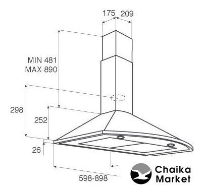конструкция Т-образная, монтаж настенный, ширина 59.8 см, управление электронное/кнопочное, производительность вытяжки 540 м³/ч, производительность мотора 1200 м³/ч, цвет нержавеющая сталь