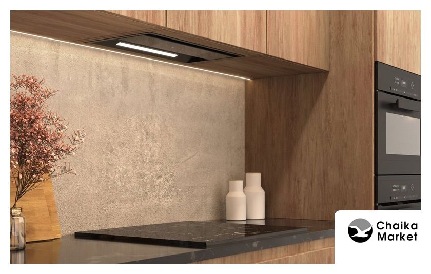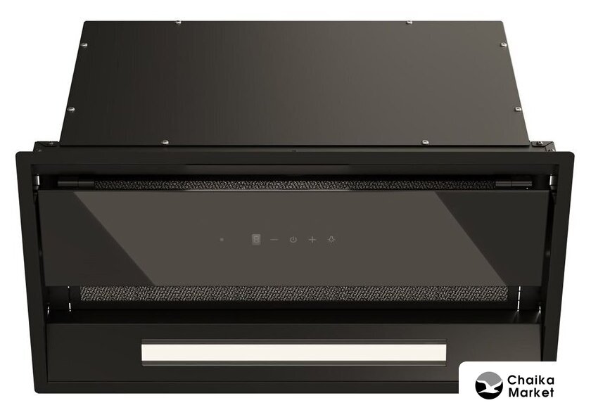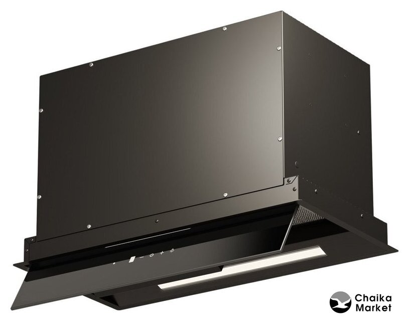 конструкция наклонная, монтаж настенный, ширина 90 см, управление сенсорное, производительность мотора 1050 м³/ч, цвет черный