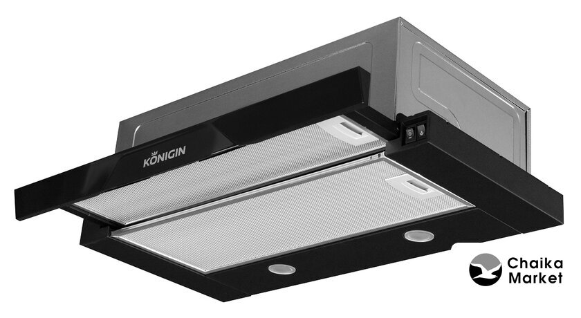 конструкция телескопическая, монтаж для встраивания, ширина 50 см, управление механическое/кнопочное, производительность мотора 650 м³/ч, цвет черный