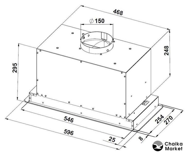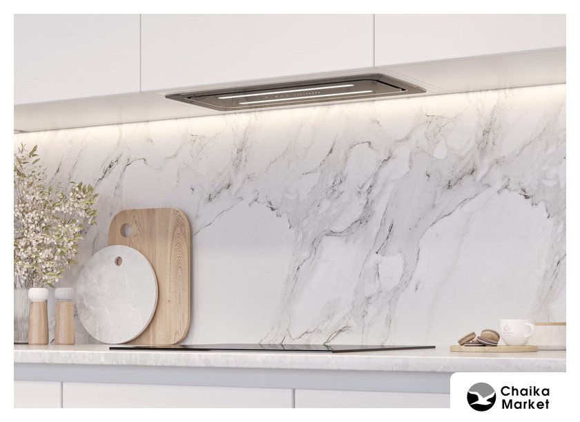конструкция скрытая, монтаж для встраивания, ширина 54 см, управление электронное/кнопочное, производительность мотора 1000 м³/ч, цвет белый