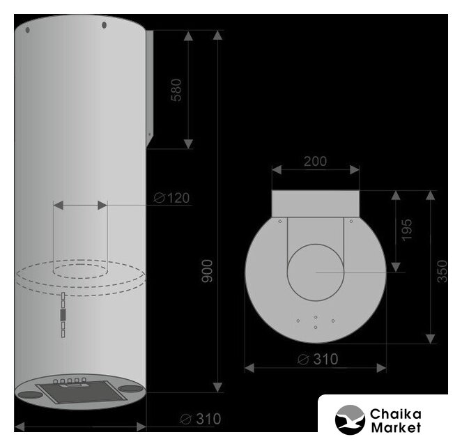 конструкция купольная, монтаж настенный, управление электронное/кнопочное, производительность мотора 950 м³/ч, ширина 60 см