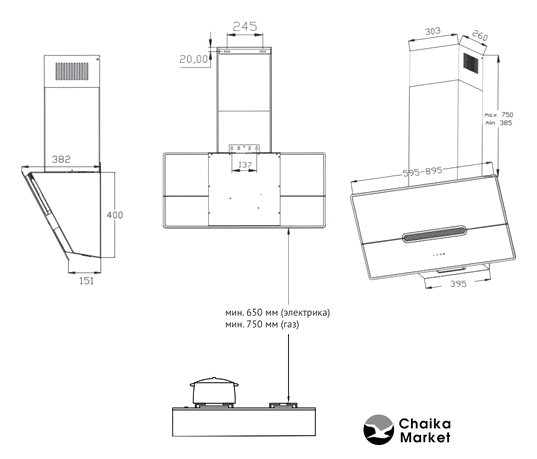 конструкция наклонная, монтаж настенный, ширина 59.8 см, управление сенсорное, производительность мотора 900 м³/ч, цвет белый