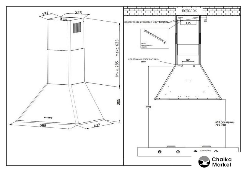 конструкция скрытая, монтаж для встраивания, ширина 59.8 см, управление механическое/кнопочное, производительность мотора 1050 м³/ч, цвет черный