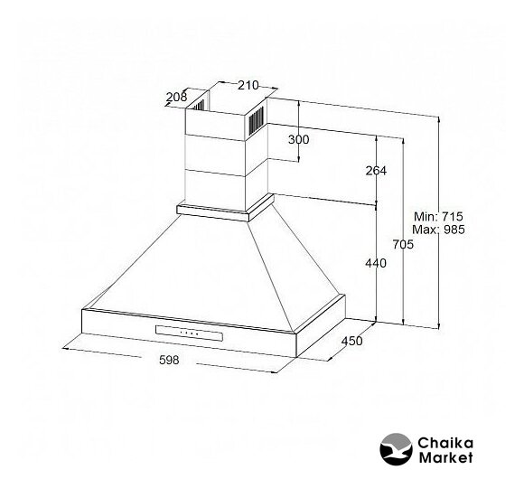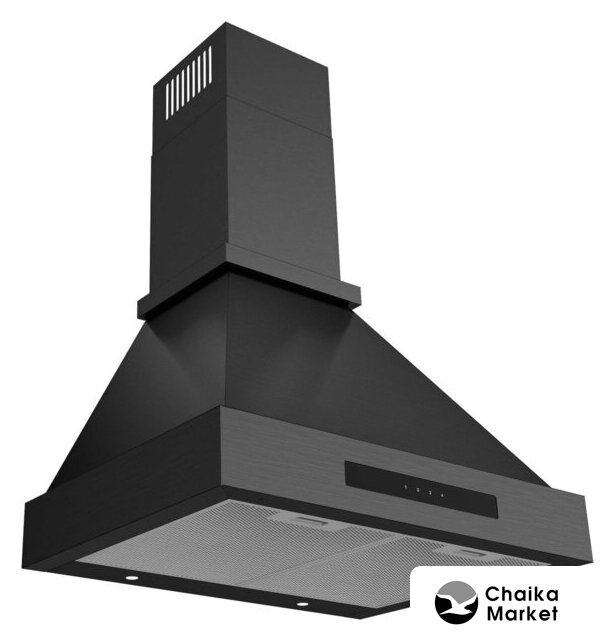 конструкция наклонная, монтаж настенный, ширина 59.6 см, управление механическое/кнопочное, производительность мотора 500 м³/ч, цвет черный