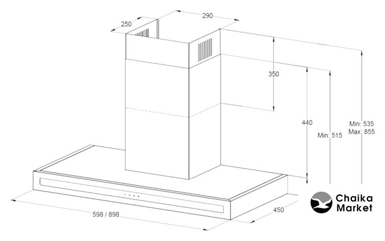 конструкция скрытая, монтаж для встраивания, ширина 89.8 см, управление электронное/кнопочное, производительность мотора 850 м³/ч, цвет нержавеющая сталь