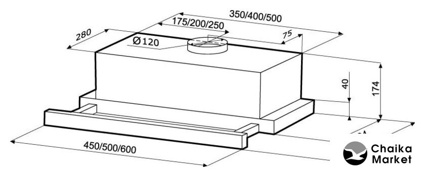 конструкция скрытая, монтаж для встраивания, управление механическое/слайдерное, производительность мотора 600 м³/ч, ширина 59.8 см