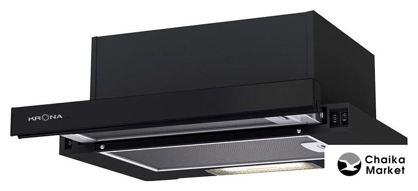 конструкция телескопическая, монтаж для встраивания, ширина 60 см, управление механическое/кнопочное, производительность мотора 520 м³/ч, цвет черный