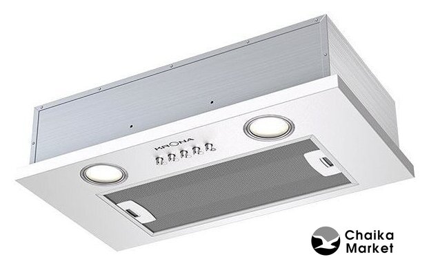 конструкция скрытая, монтаж для встраивания, ширина 59.6 см, управление механическое/кнопочное, производительность мотора 1050 м³/ч, цвет белый