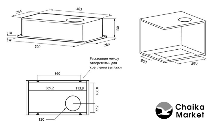 конструкция скрытая, монтаж для встраивания, ширина 52.5 см, управление механическое/кнопочное, производительность мотора 770 м³/ч, цвет черный