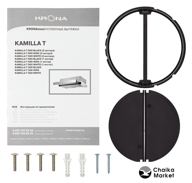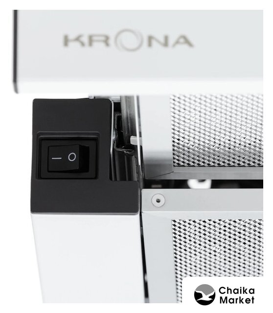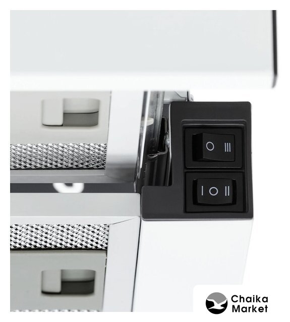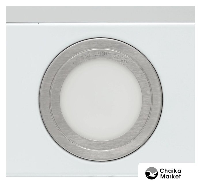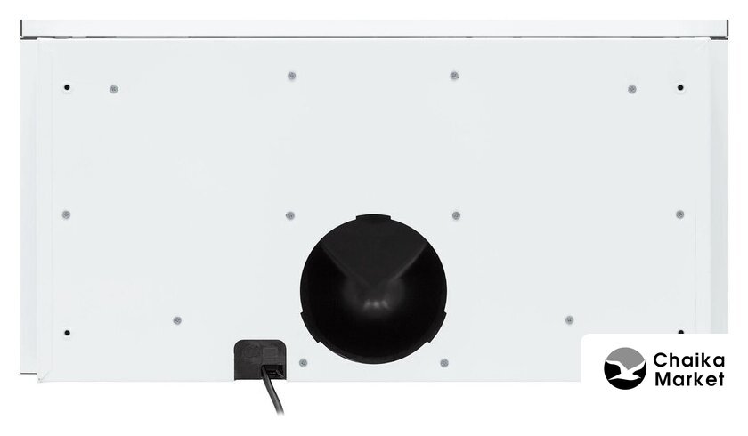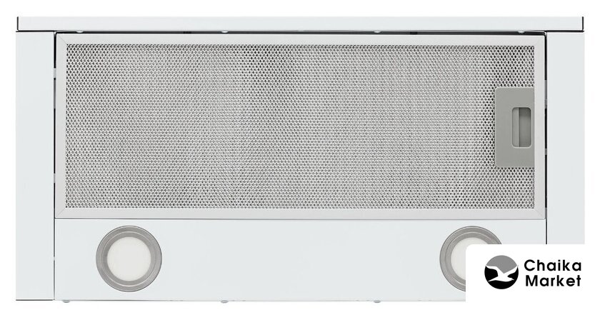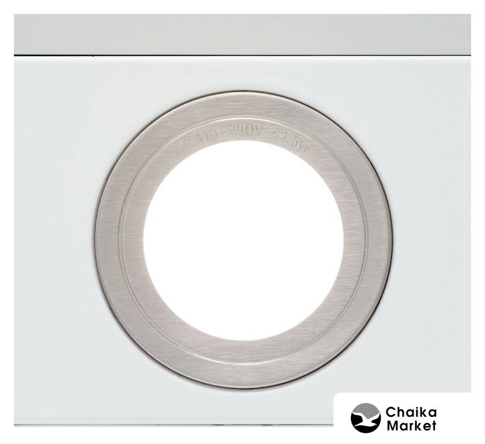 конструкция купольная, монтаж настенный, ширина 59 см, управление механическое/кнопочное, производительность мотора 180 м³/ч, цвет белый/серебристый