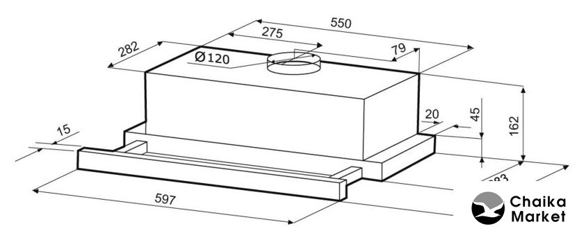 конструкция телескопическая, монтаж для встраивания, управление механическое/слайдерное, производительность мотора 600 м³/ч, ширина 60 см