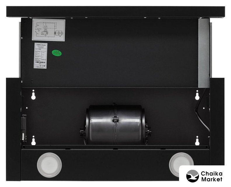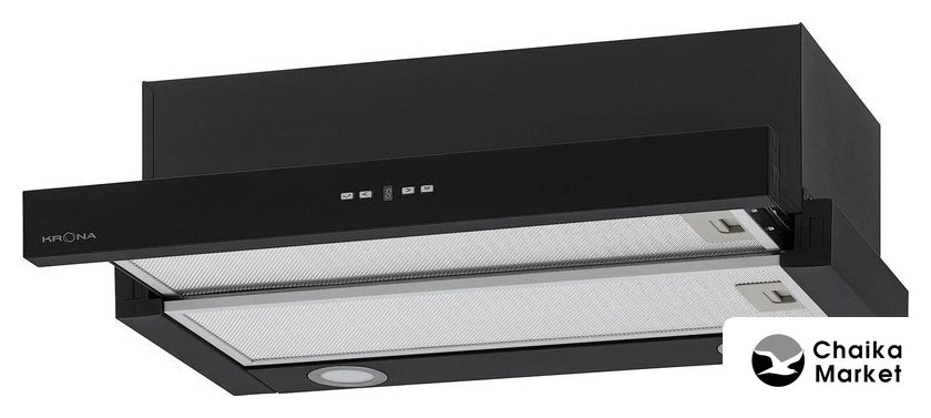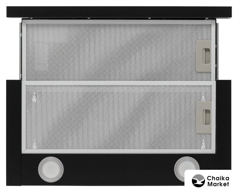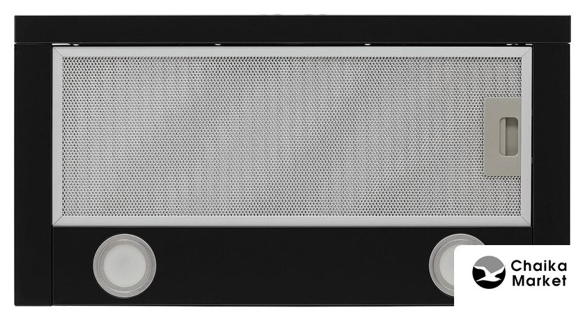 конструкция скрытая, монтаж для встраивания, ширина 59.8 см, управление механическое/кнопочное, производительность мотора 1050 м³/ч, цвет черный