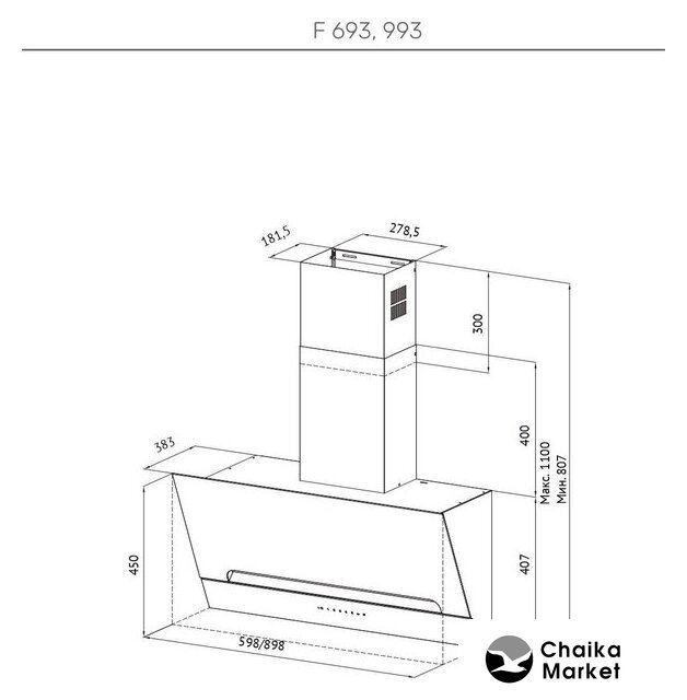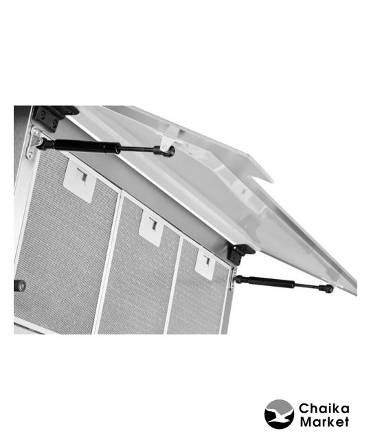 конструкция Т-образная, монтаж настенный, ширина 60 см, управление сенсорное, производительность вытяжки 950 м³/ч, цвет нержавеющая сталь/черный